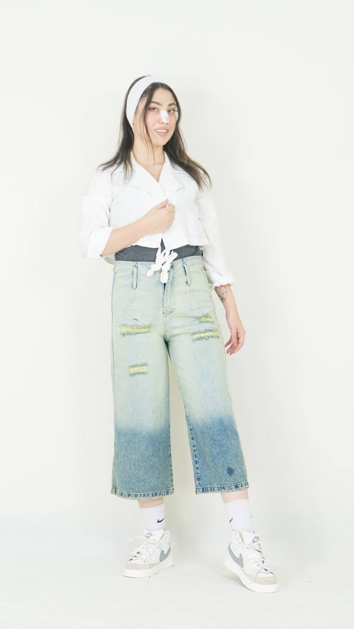 شلوار جین زنانه مدل واید لگ دورنگ سایه روشن تینت زاپ دار